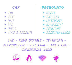 CAF - PATRONATO - MULTISERVIZI NASPI - Dis-Coll - Disoccupazione Agricola - 730 - ISEE - Ricongiungimento familiare - Ospitalità - Invalidità - Pensione - Conteggio contributivo - Bonus nido - Voucher Scuola - ADI (Assegno di Inclusione) - SFL (Supporto formazione lavoro) - Creazione cv - Gestione aziendale - Welfare aziendali - Consulenza aziendale - Consulenza Creditizia aziendale - Consulenza Viaggi - Luce e gas - Telefonia - WiFi - Multiservizi - Digi.